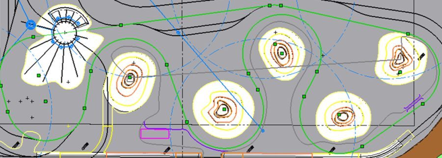 Bisher sind z.B. 302 m Gleis (im Gleisplan der grüne Linienzug) auf Gehwegplatten verlegt, die auf Folie und Splitt ausgerichtet wurden.