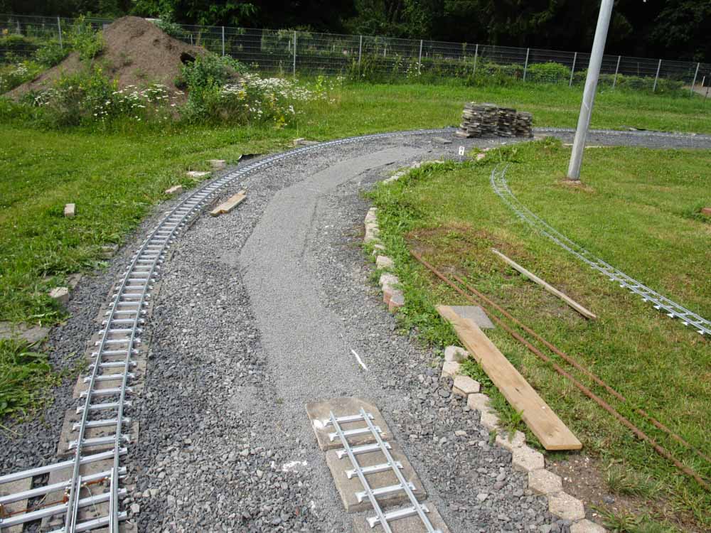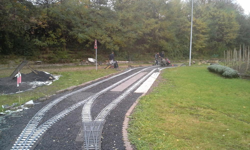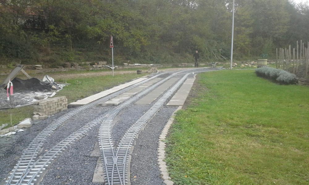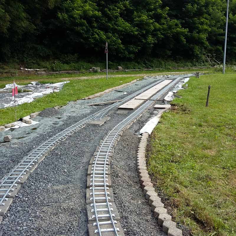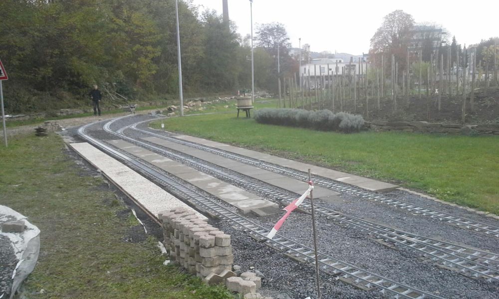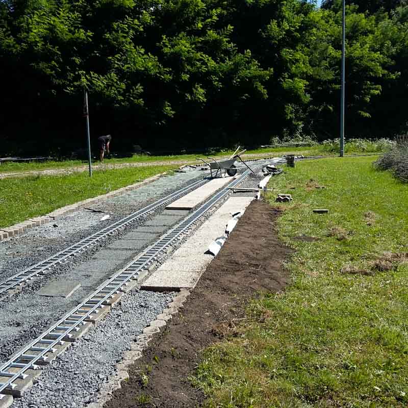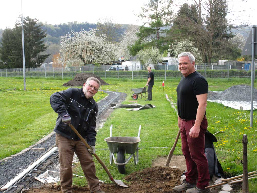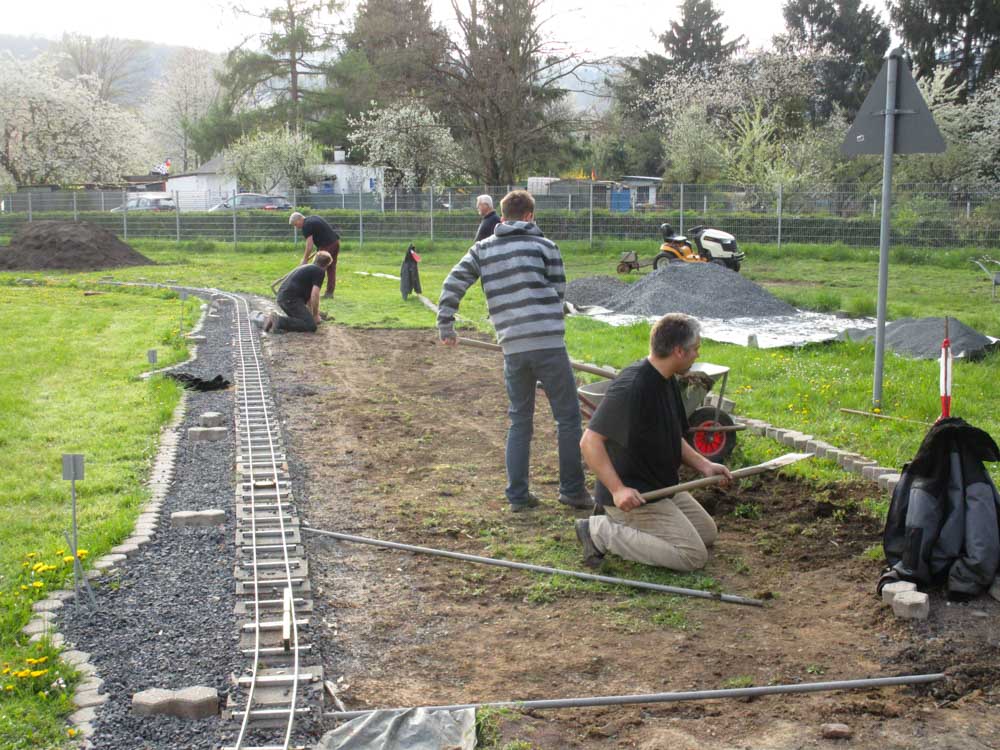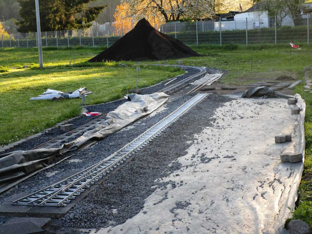 Erster Spatenstich für den neuen Bahnhof war im April 2016. Die Grasnarbe wurde auf ca. 3 m Breite und 15 m Länge abgeschält um für die drei Gleise Bahnsteige zu bauen. Die dabei entstandenen Fotos sprechen Bände. Der neue Bahnhof erweitert die Fahr- und Rangiermöglichkeiten der Anlage. Vielseitige Fahrmöglichkeiten sind das erreichte Ziel.