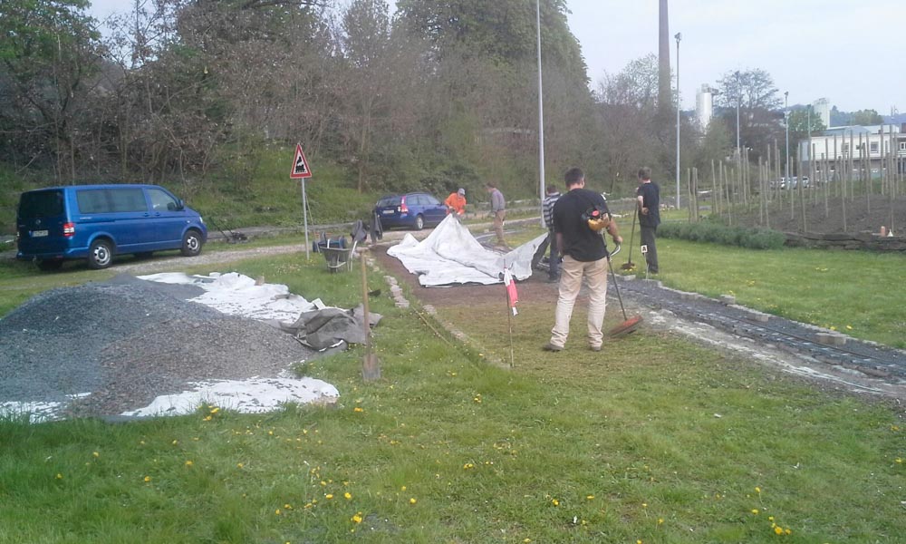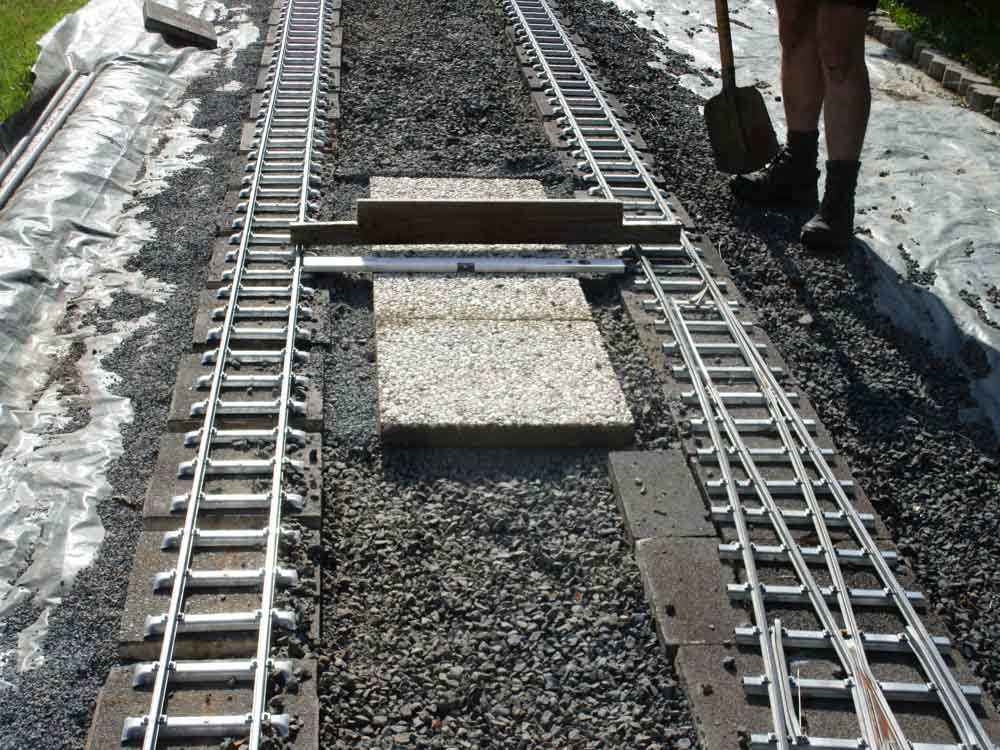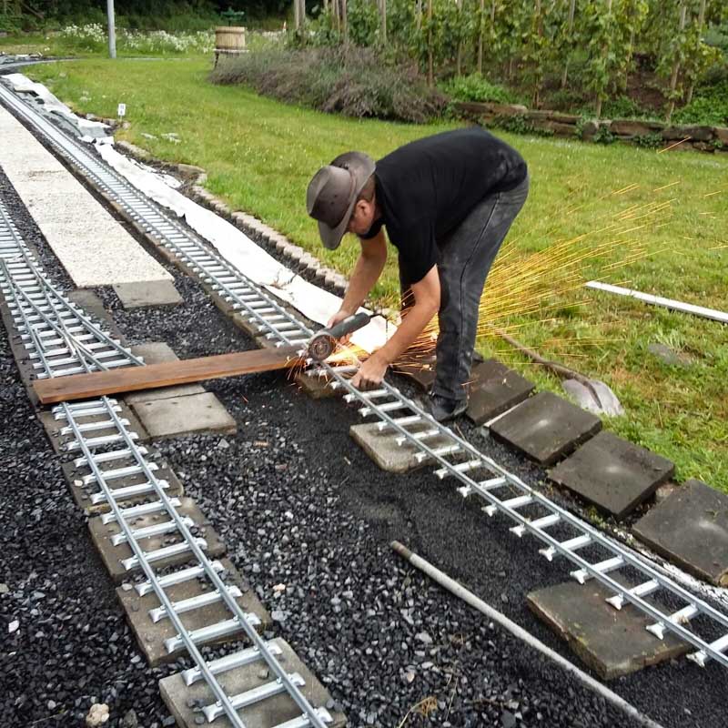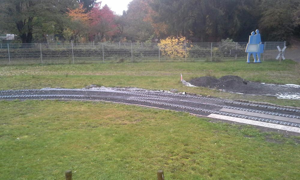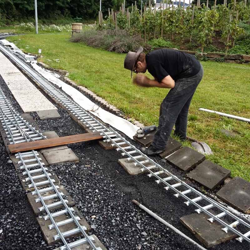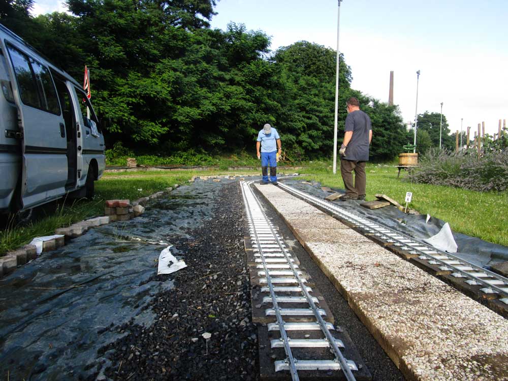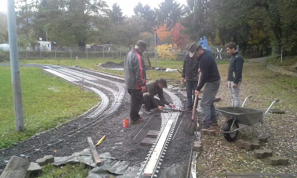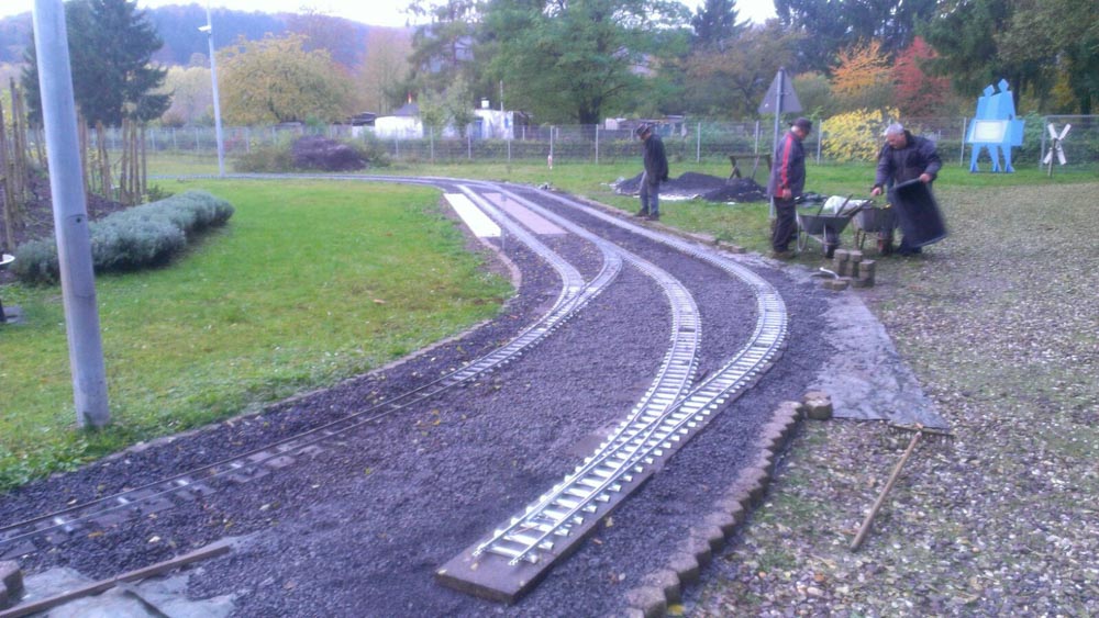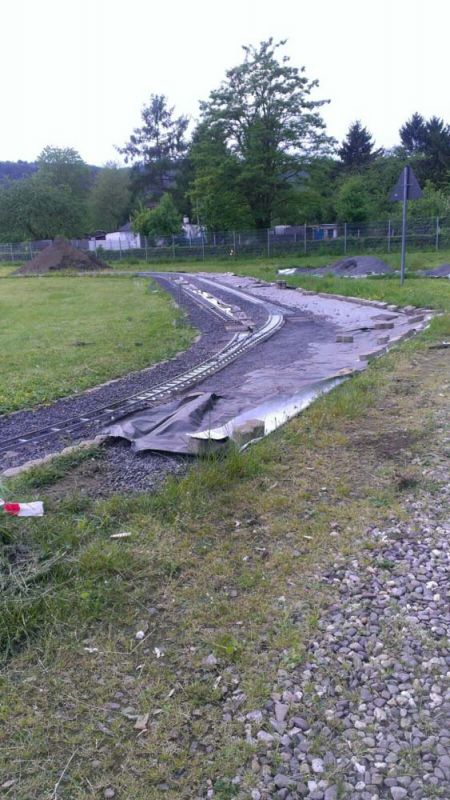 Erster Spatenstich für den neuen Bahnhof war im April 2016. Die Grasnarbe wurde auf ca. 3 m Breite und 15 m Länge abgeschält um für die drei Gleise Bahnsteige zu bauen. Die dabei entstandenen Fotos sprechen Bände. Der neue Bahnhof erweitert die Fahr- und Rangiermöglichkeiten der Anlage. Vielseitige Fahrmöglichkeiten sind das erreichte Ziel.