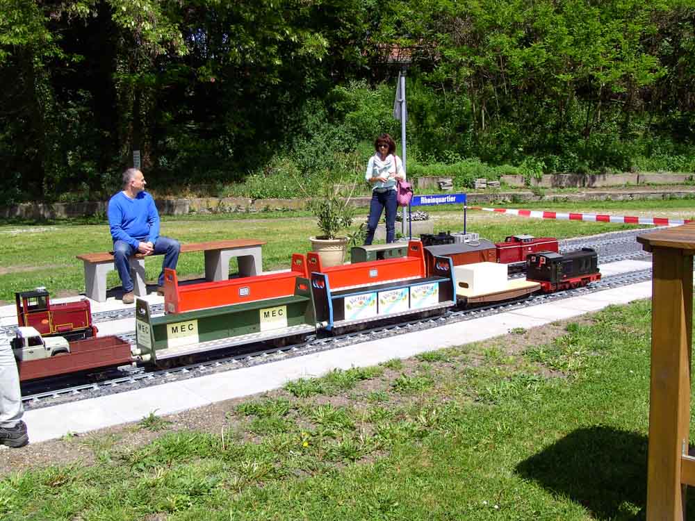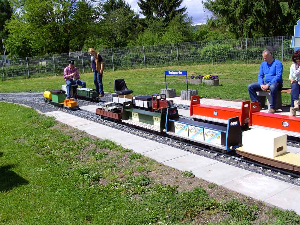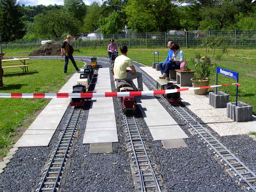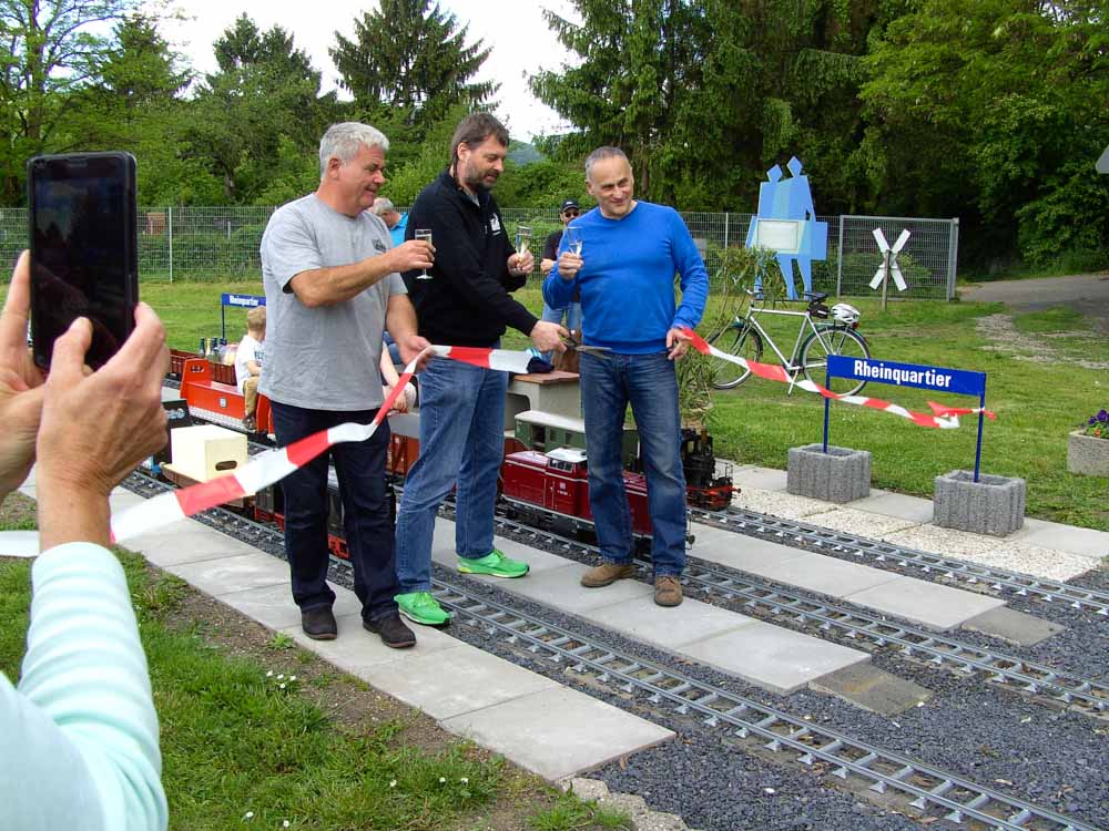 Ein Jahr Bauzeit brauchte es, um im nördlichen Teil der Gartenbahn einen neuen Bahnhof fertig zu stellen. In Anlehnung an die neue Nutzung des ehemaligen Güterbahnhofes erhielt er den Namen „Rheinquartier“. Thorsten Neumann, der Investor des Rheinquartiers, unterstützt die Gartenbahn als Attraktion für seine künftigen Bewohner. Dazu stellte er schon 2016 eine alte Signalanlage vom ehemaligen Bahngelände zur Verfügung. Mit dem Namen „Rheinquartier“ halten die Gartenbahner die Erinnerung an den alten Güterbahnhof wach und bringen gleichzeitig auch ihre Verbundenheit mit dem neuen Rheinquartier zum Ausdruck.
