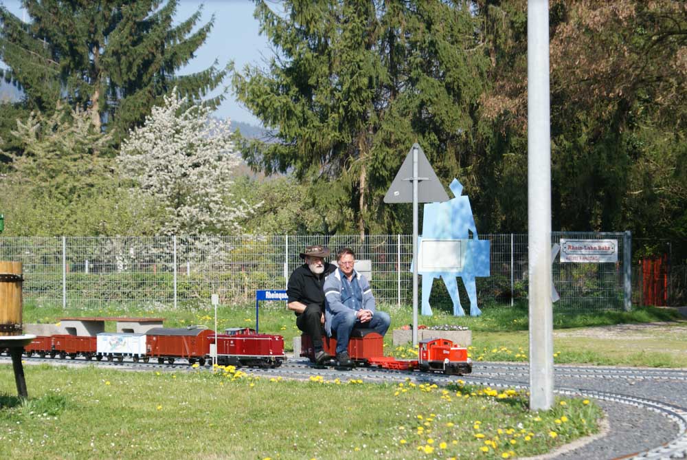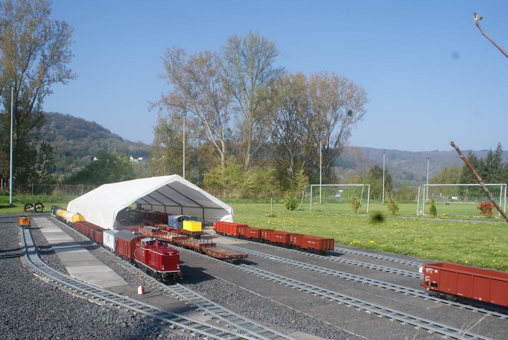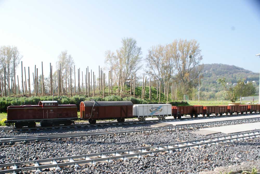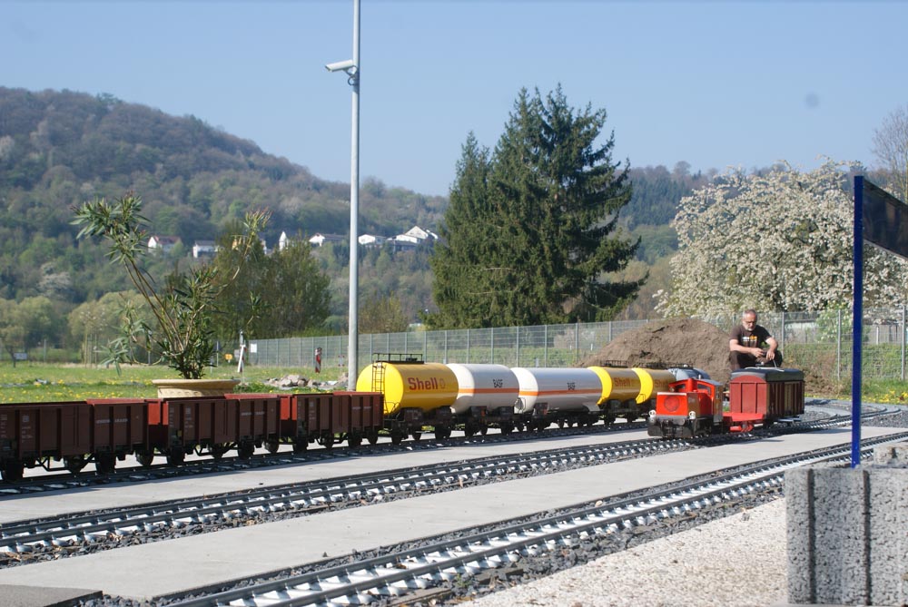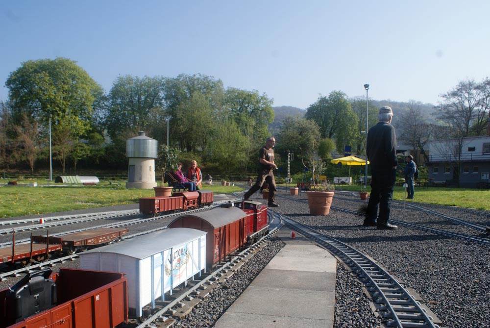 Bevor die kleinen und großen Fahrgäste die Reise am Samstag und Sonntag 8./9. April genießen konnten, gingen arbeitsintensive Tage ins Land. In der Woche vor dem ersten Fahrtag wurden die Clubmitglieder von Freunden und Bekannten aus Namborn und Roßdorf bei Erdarbeiten, Gleisbau und Gartenarbeiten unterstützt. Der Spieltrieb konnte dann am Freitag so richtig ausgelebt werden. Rangieren, Züge zusammenstellen und wieder trennen, Fahrbetrieb im Gegenverkehr mit Sicherungsschlüssel ( Tonken) wurde auf der eingleisigen Streckenabschnitt zwischen den Bahnhöfen „Am Victoriabrunnen“ und „Rheinquartier“ geprobt. Als Zugloks kamen die Modell der Regelspurdieselloks KÖF 1 und 2, V23, V36(2), V100(2) und Class 66 und ein Modell der Elektrolok 152 zum Einsatz. Kesselwagons, Flachwagons und offene Güterwagons wurden zu Ganzzügen oder gemischten Zügen zusammengestellt, getrennt und wieder zusammengefügt. Uns hat der Spieltag viel Freude bereitet und wir hoffen, dass auch die Besucher an diesem Wochenende ihre Freunde hatten.