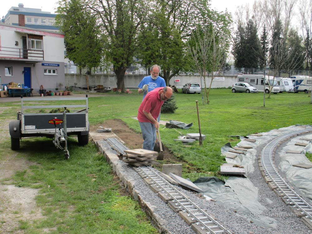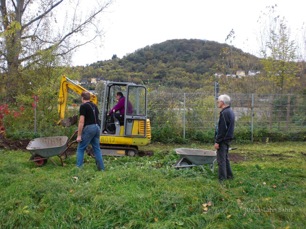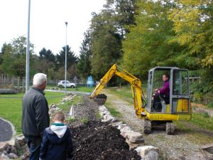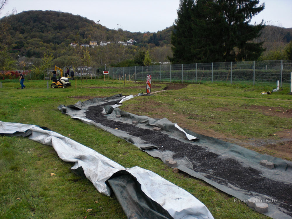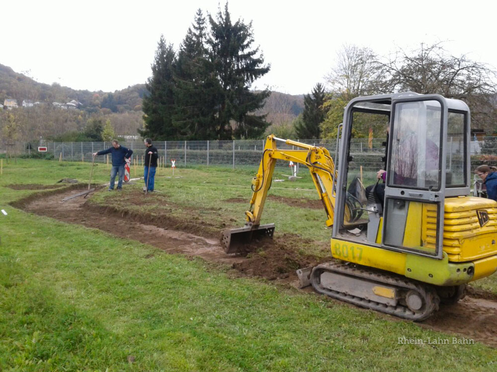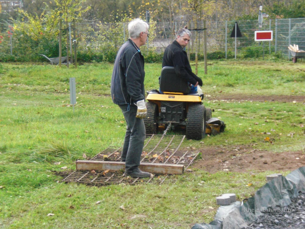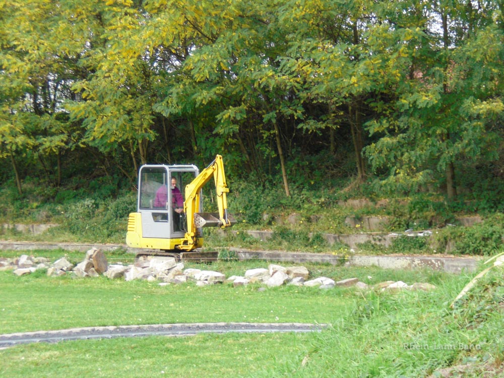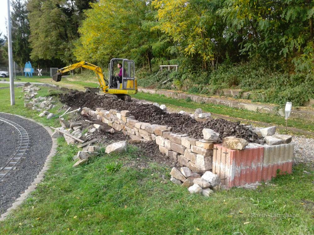 Zwar wurde der Fahrbetrieb mit einem Fahrtag im Oktober eingestellt, aber an den Winterschlaf ist nicht zu denken. Wie bereits erwähnt wurde bereits an zwei Samstagen zusätzliche Arbeitstage geleistet. Im Oktober konnte mit schwerstem Gerät, einem Minibagger, die Trasse vom Heidepark zum zukünftigen Biergarten „zum Wilden Eck“ angelegt werden. Die ersten Fuhren groben Schotter wurden auch schon eingebracht. Auch half der Minibagger bei der Gestaltung der Brückenrampe kräftig mit und erspart uns einige Stunden und Tage schweißtreibende und kräftezehrende Tätigkeit. Die laufbahnseitige Trockenmauer konnte bereits fertig gestellt werden. Parallel waren auch die Gleisbauer nicht untätig und schraubten alle für 2018 benötigte Gleise schon zusammen.