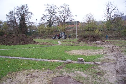 Leider kommt das Großgerät nicht überall hin, und so ist auch an diesem Tag wieder einmal Handarbeit gefragt. An der ehemaligen Tribüne wurden die untersten zwei Stufen nochmals gesäubert.